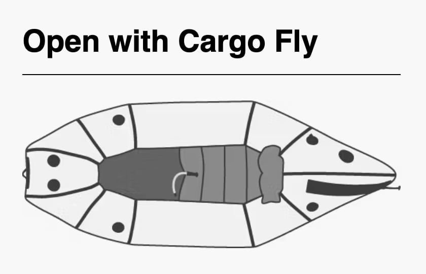 カーゴフライ付きのカリブーは、カーゴ フライジッパー付きのオープンビルド構成で利用できるため、パックラフトのチューブ内部にギアを収納できます。